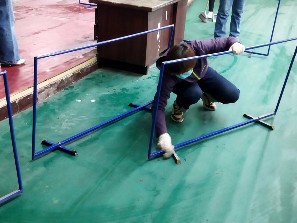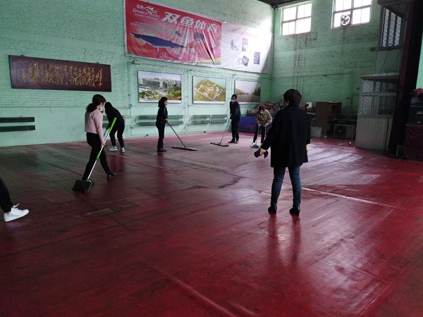 參與活動(dòng)的20余名同志,分工合作,雖然大家來(lái)自不同部門(mén)、不同崗位,但爭先恐后、合作默契,清理地面、擦拭健身器材、清潔桌凳?!扒懊娴哪型緜兗佑土?,我們快趕上你們了!”負責拖地的九分公司主任經(jīng)濟師劉彩在后面說(shuō)道?!斑@個(gè)乒乓球擋布拿抹布擦拭的效果不太好,用外面的高壓水槍沖洗試試吧!”九分公司主任會(huì )計師付世芳一邊用抹布擦拭擋布一邊提出自己的合理化建議,“這個(gè)辦法好!”九分公司綜合辦公室主任張路平同意道。