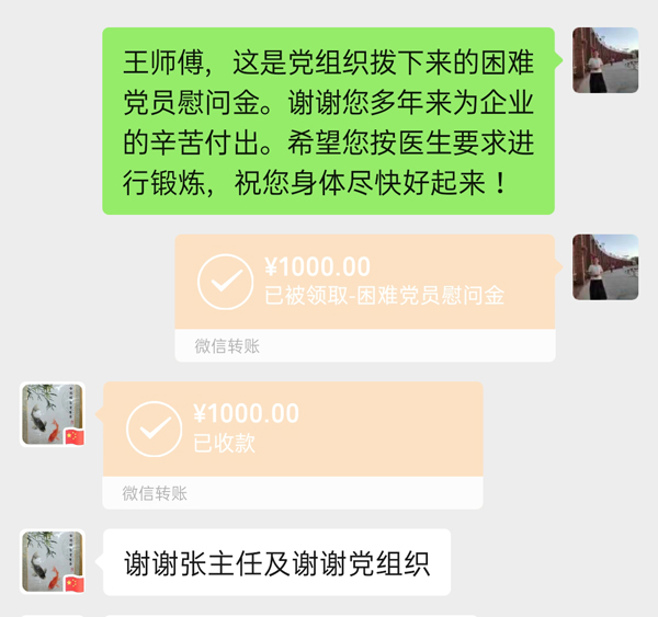 “現在身體怎么樣?生活可有什么困難?”因受疫情影響,不能對所有困難黨員和困難職工實(shí)現入戶(hù)走訪(fǎng),公司黨委和工會(huì )就通過(guò)電話(huà)一一聯(lián)系,仔細詢(xún)問(wèn)他們疫情防控期間生活情況、身體健康狀況,根據他們的實(shí)際情況,將慰問(wèn)金通過(guò)微信轉賬發(fā)給個(gè)人,米面油等慰問(wèn)品能送到小區門(mén)口的送到小區門(mén)口,能送到工地的送到工地。