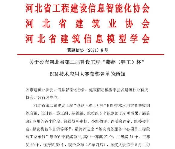 據悉,本次大賽由河北省工程建設信息智能化協(xié)會(huì )、河北省建筑業(yè)協(xié)會(huì )、河北省建筑信息模型學(xué)會(huì )共同舉辦,共收到237項參賽成果,最終評選出一等獎27個(gè),二等獎51個(gè),三等獎69個(gè),優(yōu)秀獎59個(gè)。此次獲獎,充分展現了公司BIM技術(shù)應用水平和實(shí)力,彰顯了企業(yè)品牌形象。(BIM中心