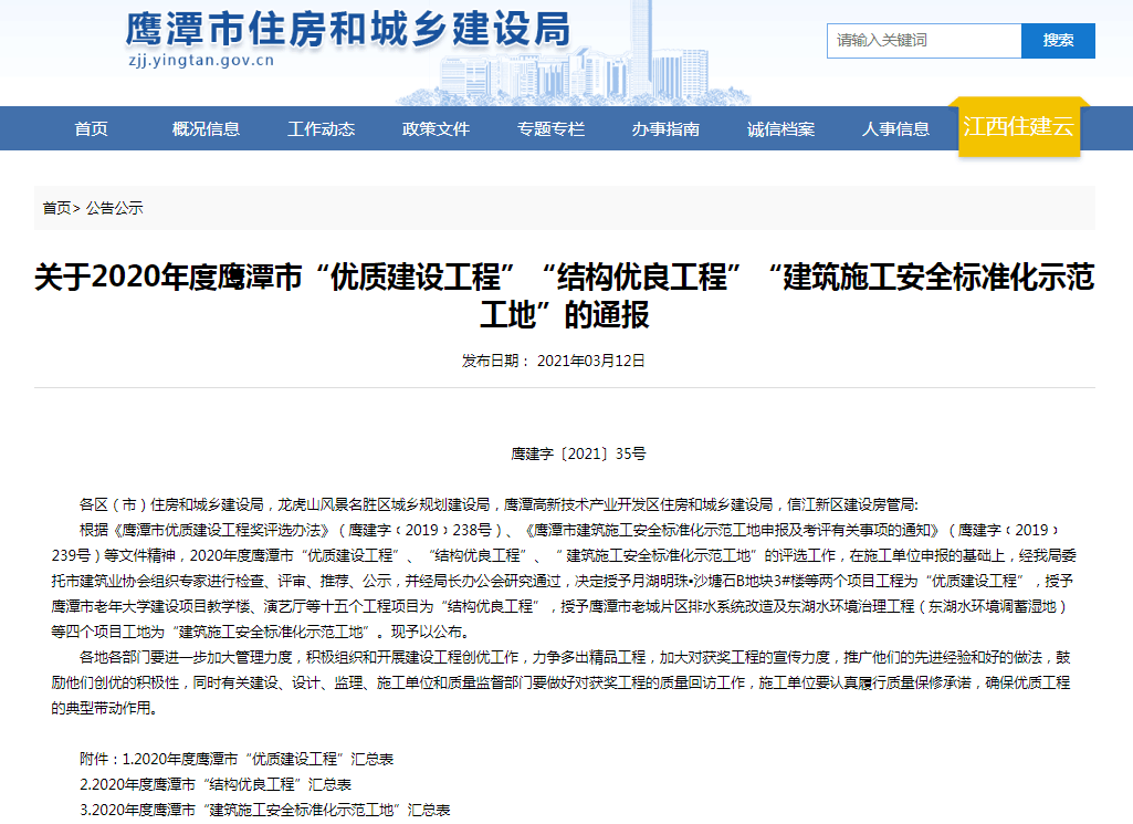 4月12日,從江西省鷹潭市住房和城鄉建設局網(wǎng)站獲悉,四分公司承建的鷹潭市檔案中心項目喜獲2020年度鷹潭市結構優(yōu)良工程和建筑施工安全標準化示范工地兩項榮譽(yù)。