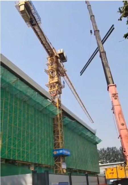 “大臂往右,慢一點(diǎn)……”塔吊下,信號工通過(guò)對講機指揮塔吊緩慢旋轉避讓。隨后,負重吊車(chē)精準、平穩地將鋼梁吊裝到施工區。